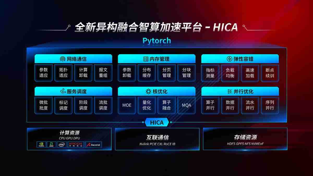 通过自研的服务层、、、、中间适配层、、以及调度编排算法,,采用数据并行、、模型并行等多种并行方式,,,,把并行计算任务进行有效的分解,,,使其分别由相应的软件栈和算力资源来承接。。当GPU资源变化,,,,HICA可以实时动态调度计算子任务并调整模型拓扑和架构,,以充分聚合各种算力资源。。