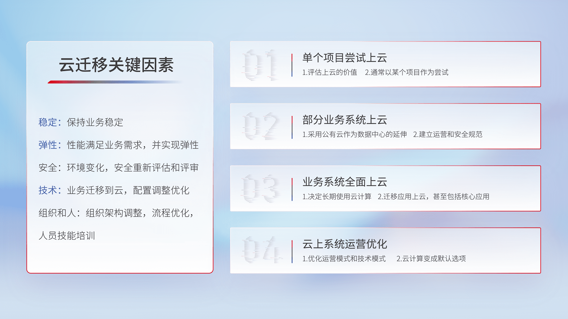 结合实际业务,,从规划设计、、、、云平台选型、、、云原生改造、、数据迁移、、、集成交付,,迁移全过程为客户识别最佳上云路径,,做好风险识别管理,,,设计网络架构、、、身份权限、、、、安全审计合规、、、、操作审计、、、日志审计、、、、监控告警策略、、、、多站点容灾设计等,,对云上基础设施进行整体规划,,,,提升IT治理水平,,,以满足弹性、、、、高可用、、、高性能的需求。。。