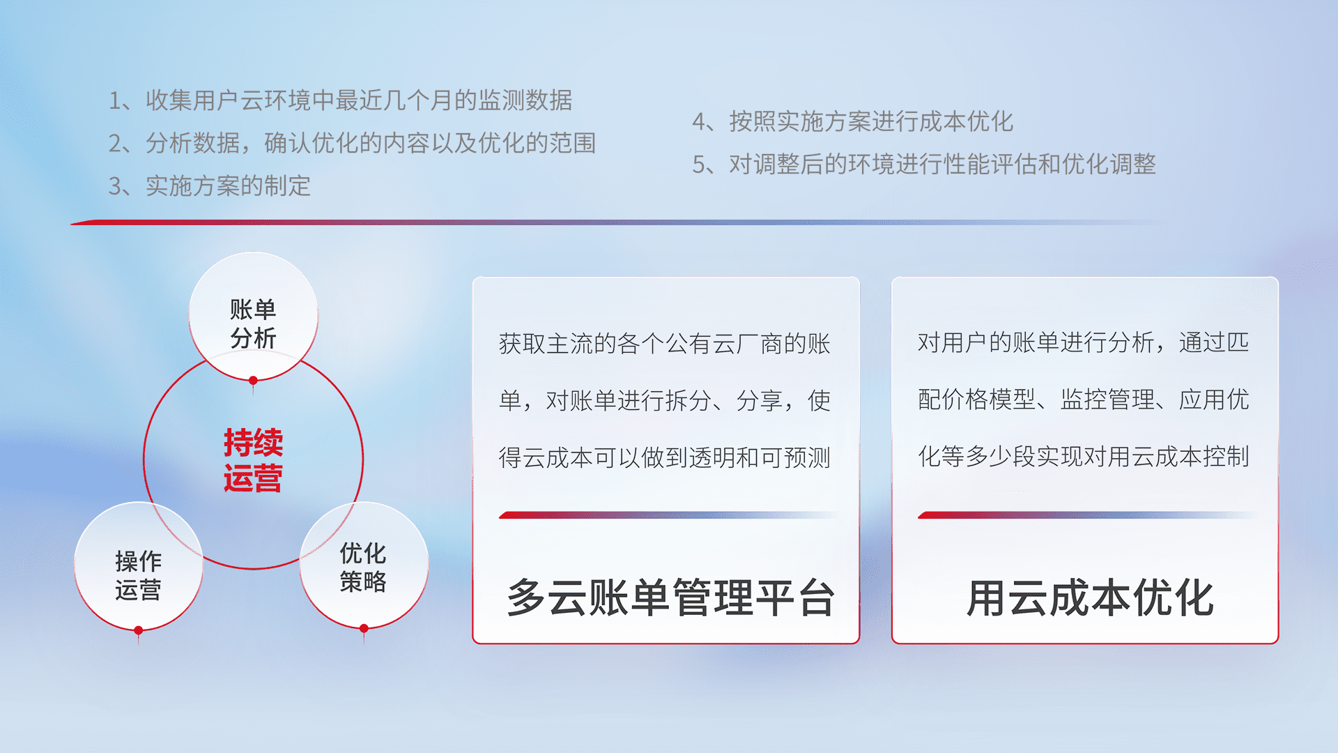 通过多云纳管,,以统一的资源数据模型把客户的云资源进行抽象和封装,,,,进而实现对多云资源的统一操作,,,保障云资源管理的可靠性、、、、稳定性与可用性。。量身定制化运维内容,,,配置、、、开发运维、、、、补丁管理、、、、备份、、监控、、认证和访问管理、、、、审计和日常巡检等,,,,保障在用云过程中的可靠度,,稳定度以及高可用率。。。。